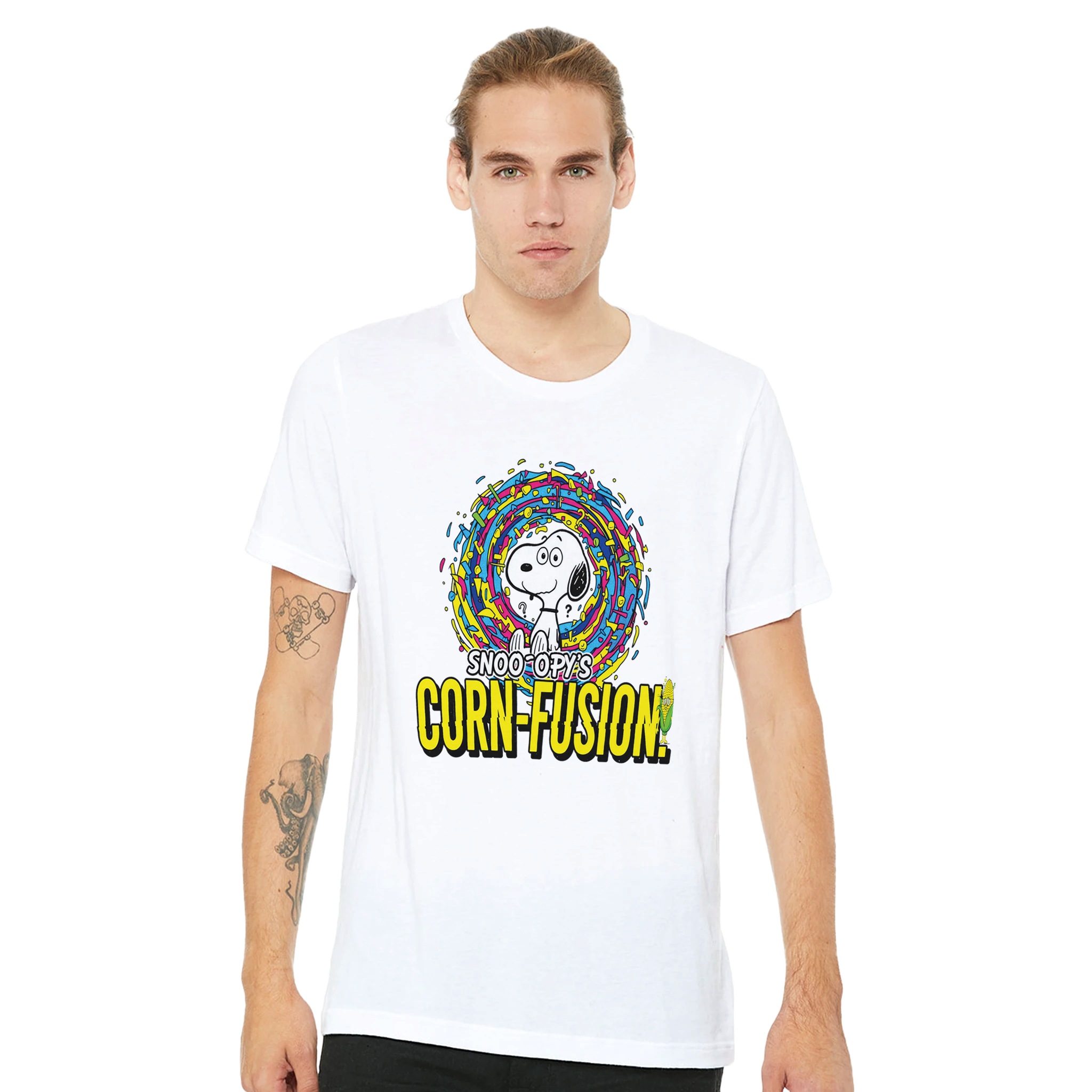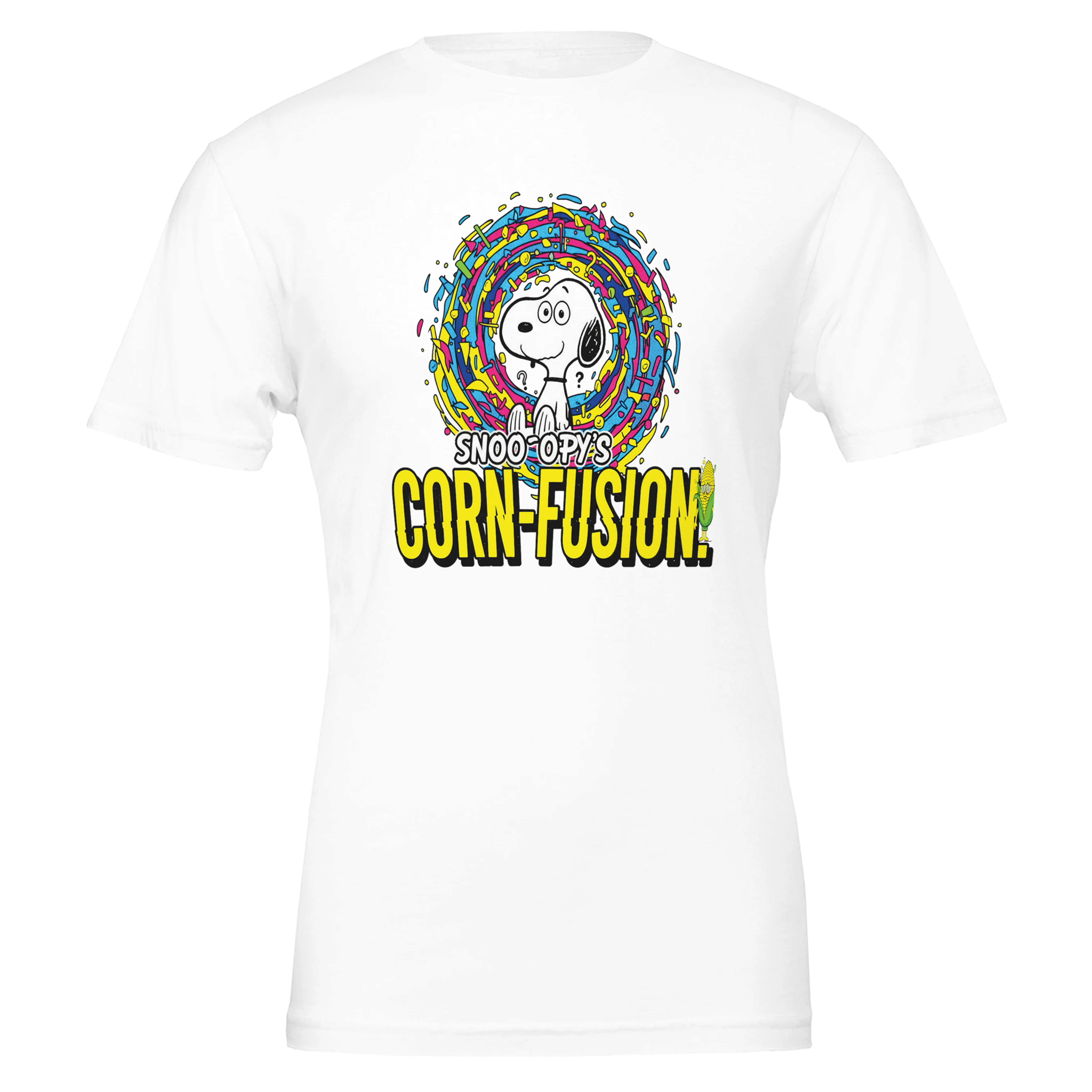 This t-shirt is renowned for its soft feel and sturdy construction, ideal for DTG printing. Snoopy Corn-fusion Corny Pun Confusion Funny Cartoon Premium Crewneck T-shirt is for the lovers of snoopy, comfort, funny puns where corny meets cool.